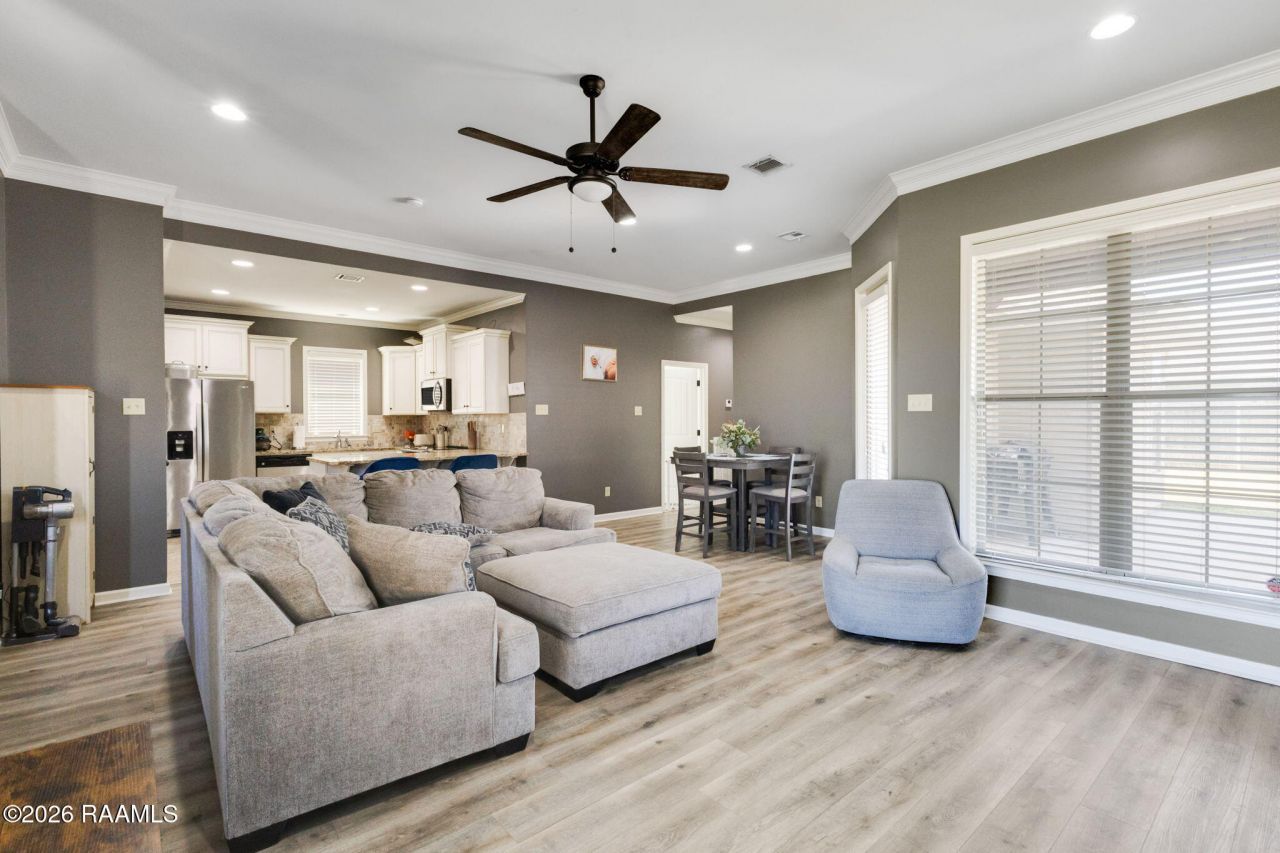 A lovely home located in the Wells Landing subdivision, just minutes from Rouses, Youngsville Sports Complex, Sugar Mill Pond, and local dining. The open-concept layout features neutral tones and large living room windows that fill the space with natural light. The kitchen includes stainless steel appliances, granite countertops, tile flooring, and a stylish tile backsplash. The primary suite offers tray ceilings, a double vanity, a separate shower, an oversized soaking tub, and a walk-in closet. Outdoor highlights include a covered patio and beautifully landscaped front and back yards.